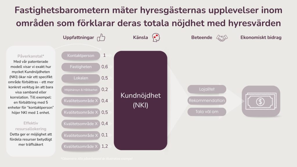 Många fastighetsbolag vet att hyresgästernas nöjdhet är viktigt, men att veta exakt vad som bör förbättras, och vad det faktiskt leder till, är en större utmaning. Du behöver en metod som hjälper dig att gå från känsla till fakta och från insikt till affärsresultat. Med ett tydligt orsakssamband mellan upplevelse och resultat blir det lättare att prioritera rätt. En enhets ökning i NKI mätt med CFI-metoden är i snitt kopplad till en 1% ökning i intäkter och en 4,6 % ökning i marknadsvärde. Det är ett tydligt kvitto på att nöjdare hyresgäster inte bara är en ambition, utan en konkret affärsfördel.